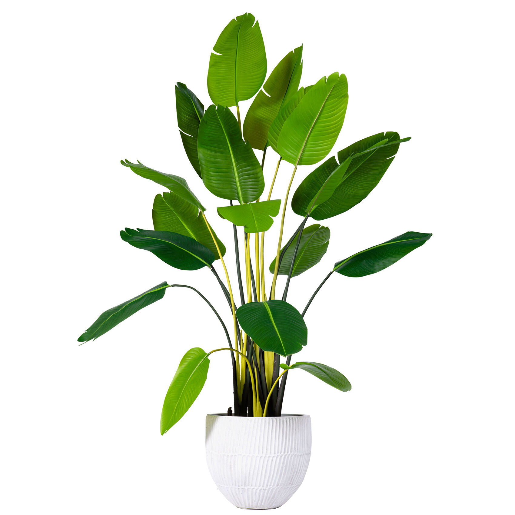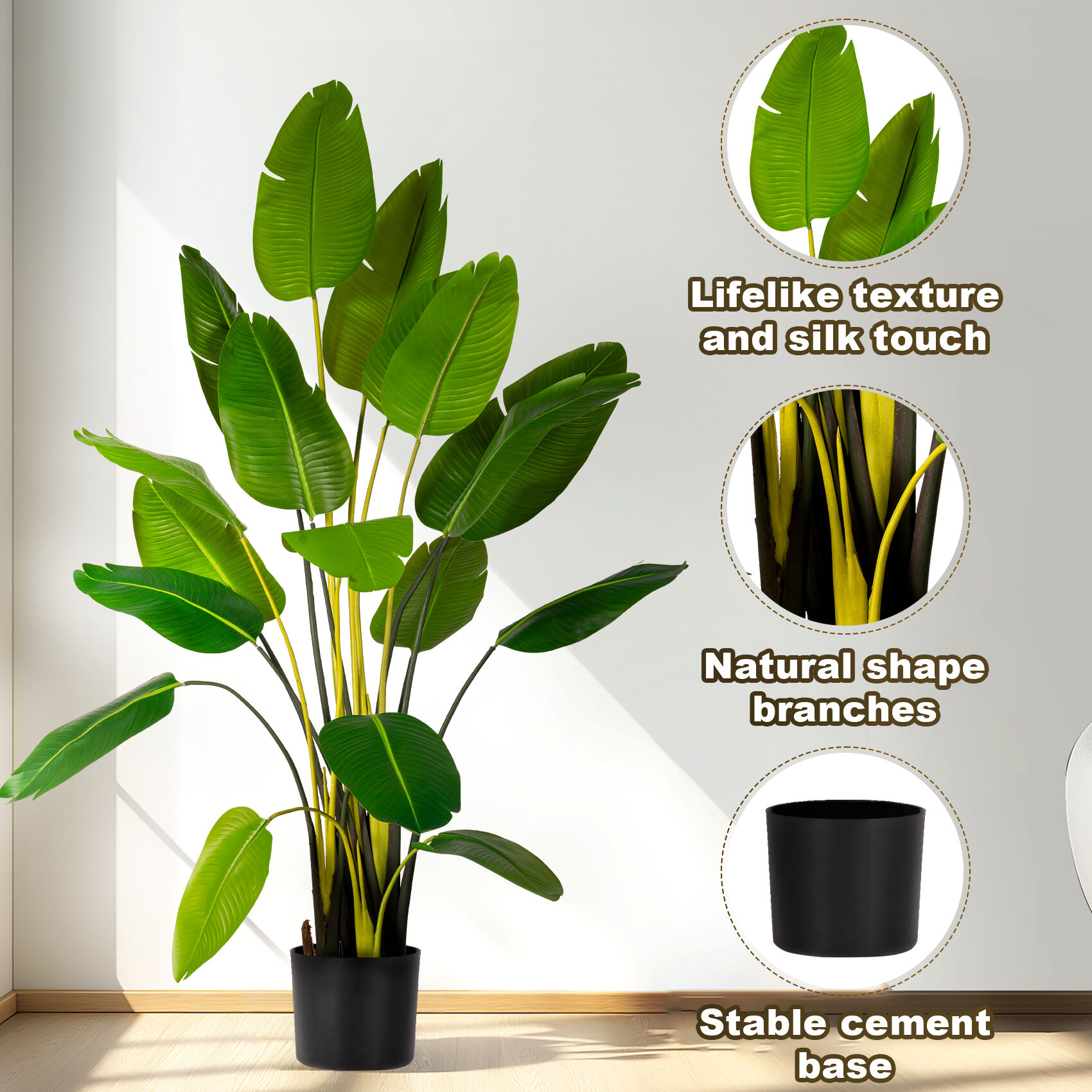 Advanced manufacturing techniques ensure that each leaf displays realistic surface texturing, including the subtle variations in sheen and matte finishes that characterize natural banana tree foliage. The stem and trunk components feature authentic bark patterns and coloration achieved through specialized molding and finishing processes. This attention to detail extends throughout the entire plant structure, creating a cohesive and convincing botanical replica.