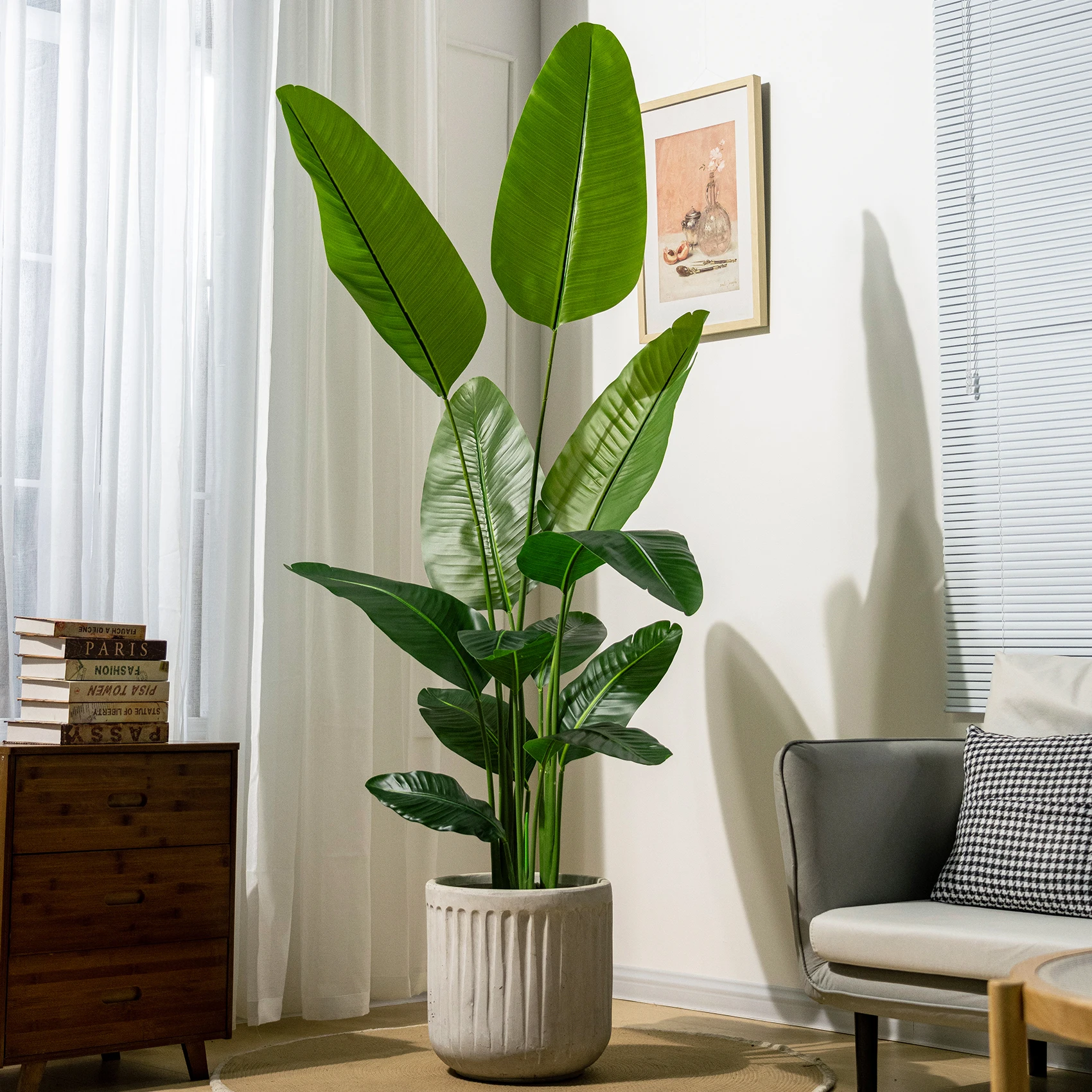 The artificial palm trees and decorative greenery feature meticulously crafted details that replicate natural plant characteristics with remarkable accuracy. Each leaf displays authentic color gradations, natural imperfections, and realistic surface textures that create convincing visual depth. The artificial bonsai specimens incorporate traditional styling principles with carefully positioned branches and foliage arrangements that reflect centuries-old horticultural practices.