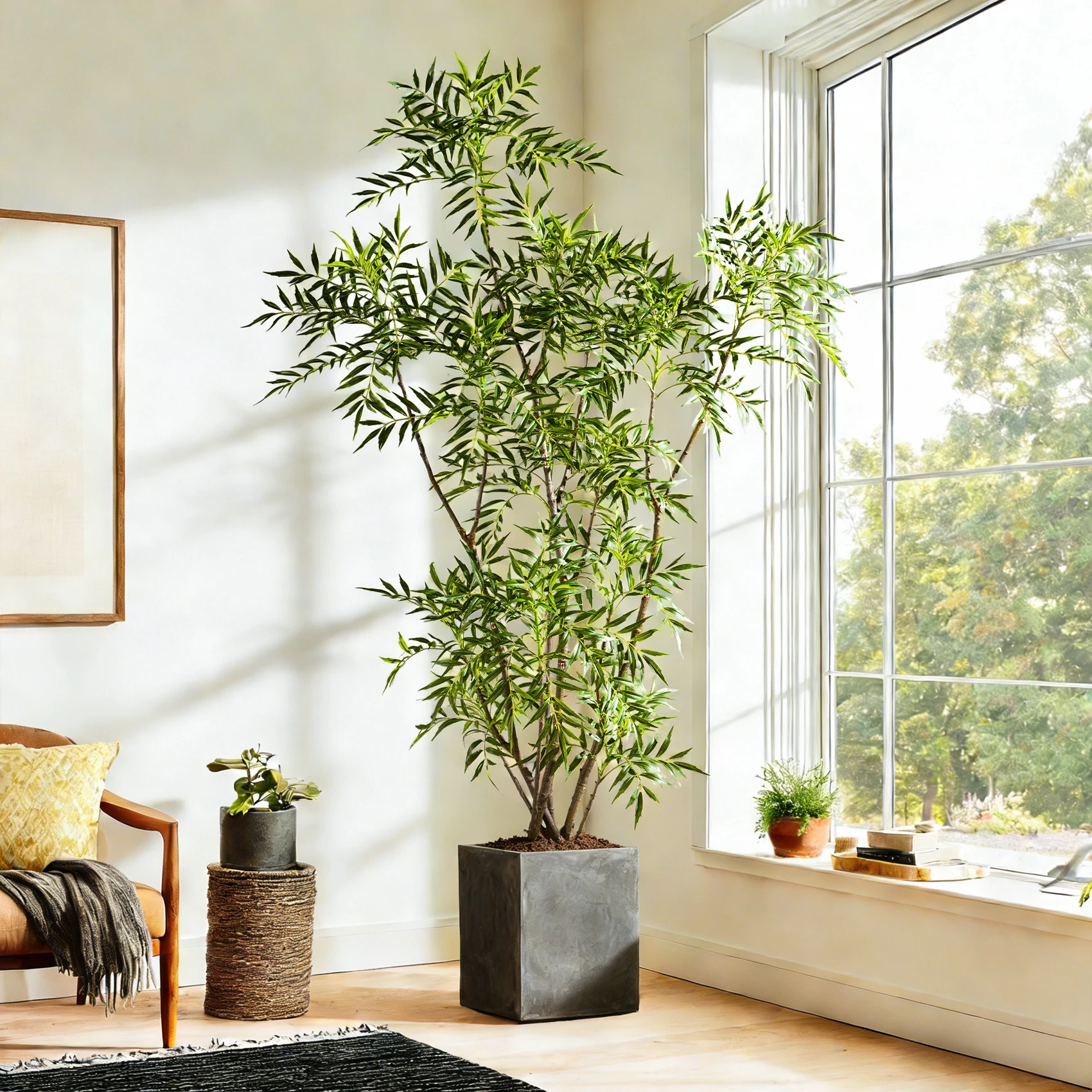 Engineered for longevity, this Realistic Artificial Bamboo Tree in White Pot utilizes high-grade materials that maintain their appearance and structural integrity over extended periods. The reinforced stem construction provides stability while remaining lightweight enough for easy repositioning, and the weather-resistant components allow for both indoor and covered outdoor applications.